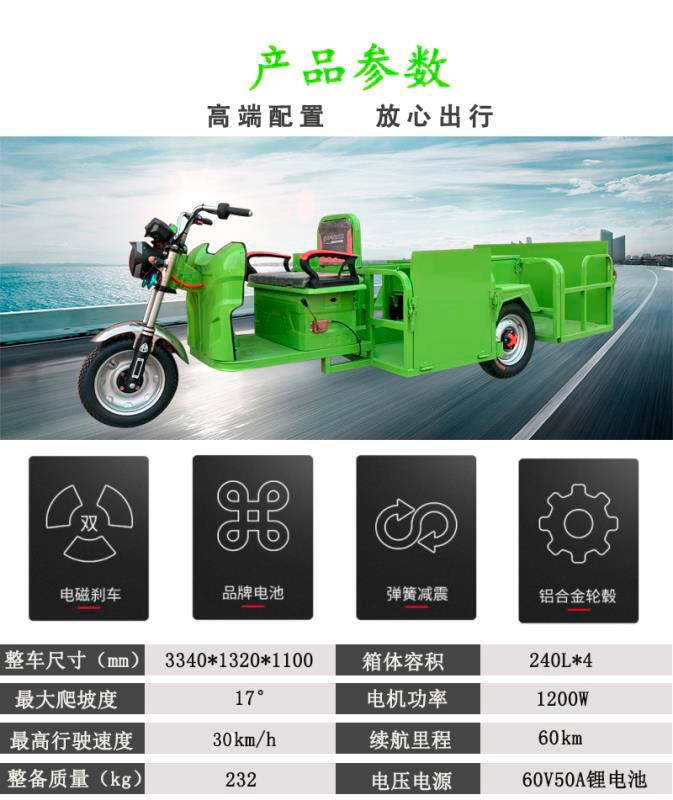 產(chǎn)品簡介:型號:JA1500DZH-8,整車尺寸(mm):3340*1320*1100,箱體容積:4個240L垃圾桶,電機(jī)電壓60V