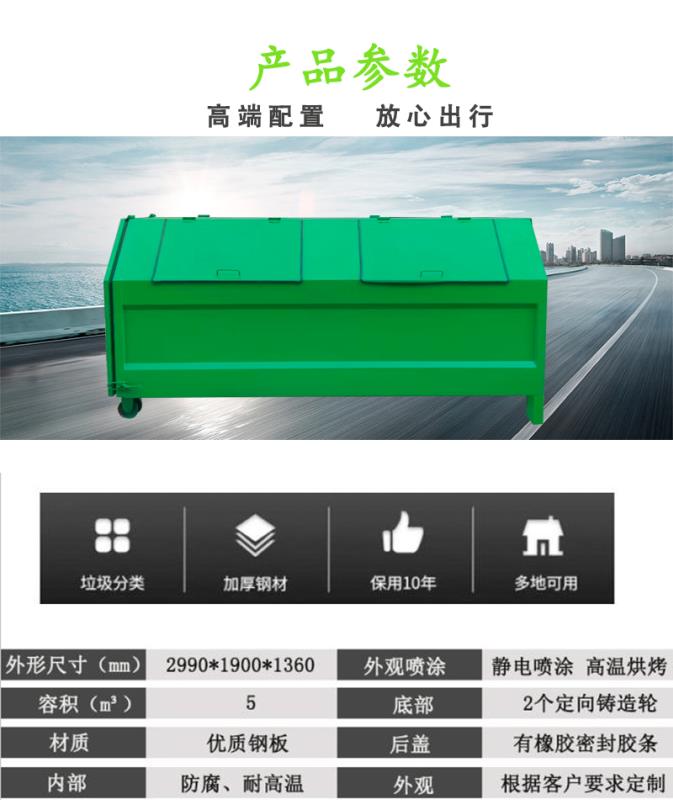 產(chǎn)品簡(jiǎn)介:垃圾箱容積:5立方,采用靜電噴涂和高溫烘烤的工藝,漆面平整光滑。